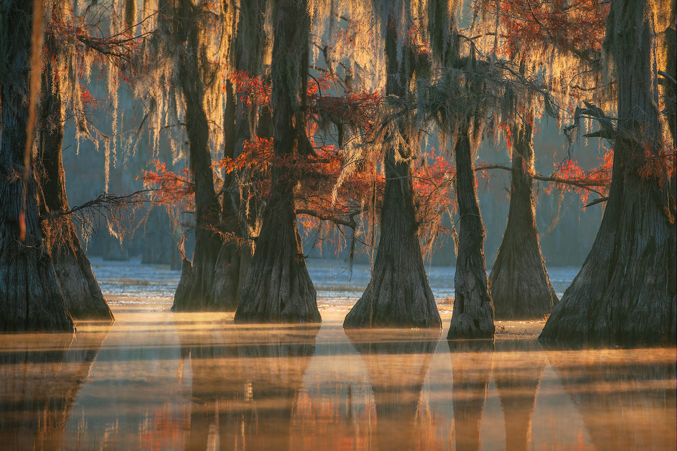 As the morning sunset illuminates the red cypress the cool shadows of the swamp in the background rest in a shady contrast.